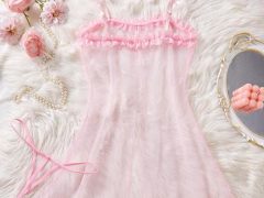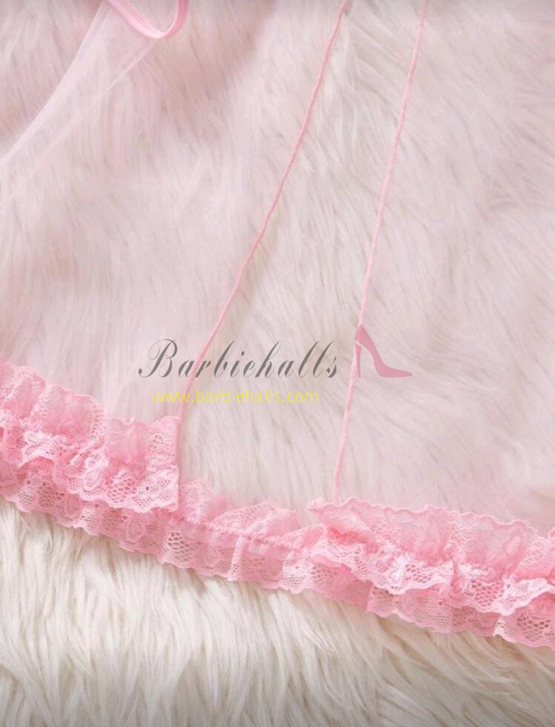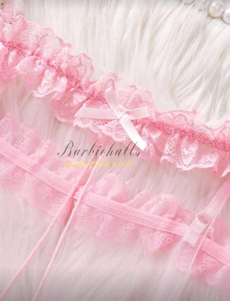 Pijama rosa para mujer, camisón kawaii con decoración de lazo, encaje y malla transparente para boda, con abertura, ribete de lechuga, lencería nupcial, conjunto de lencería sexy, conjunto de vestido de tul sexy.
