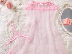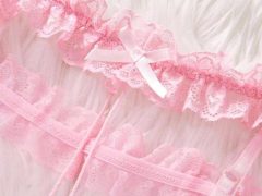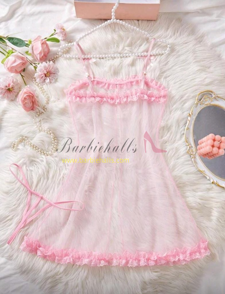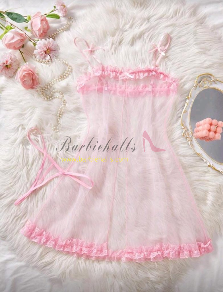 Pijama rosa para mujer, camisón kawaii con decoración de lazo, encaje y malla transparente para boda, con abertura, ribete de lechuga, lencería nupcial, conjunto de lencería sexy, conjunto de vestido de tul sexy.