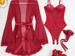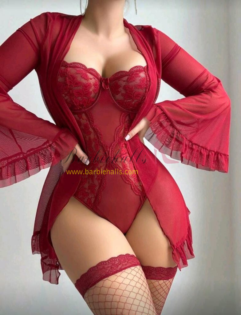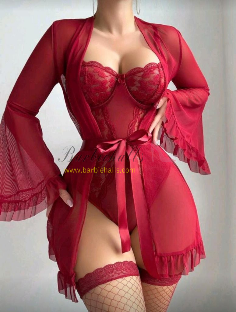Set de 5 piezas: Body con abertura sexy + Bata + Cinturón + 1 par de medias para salir
