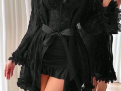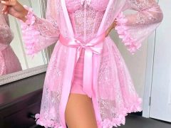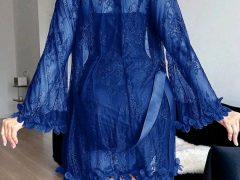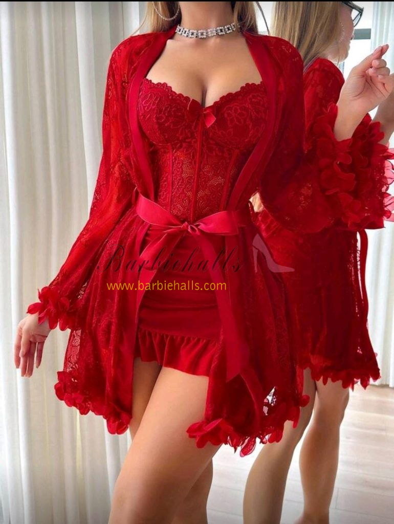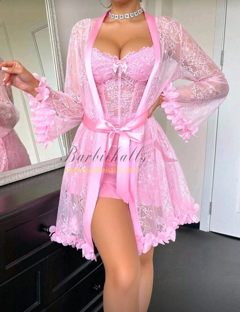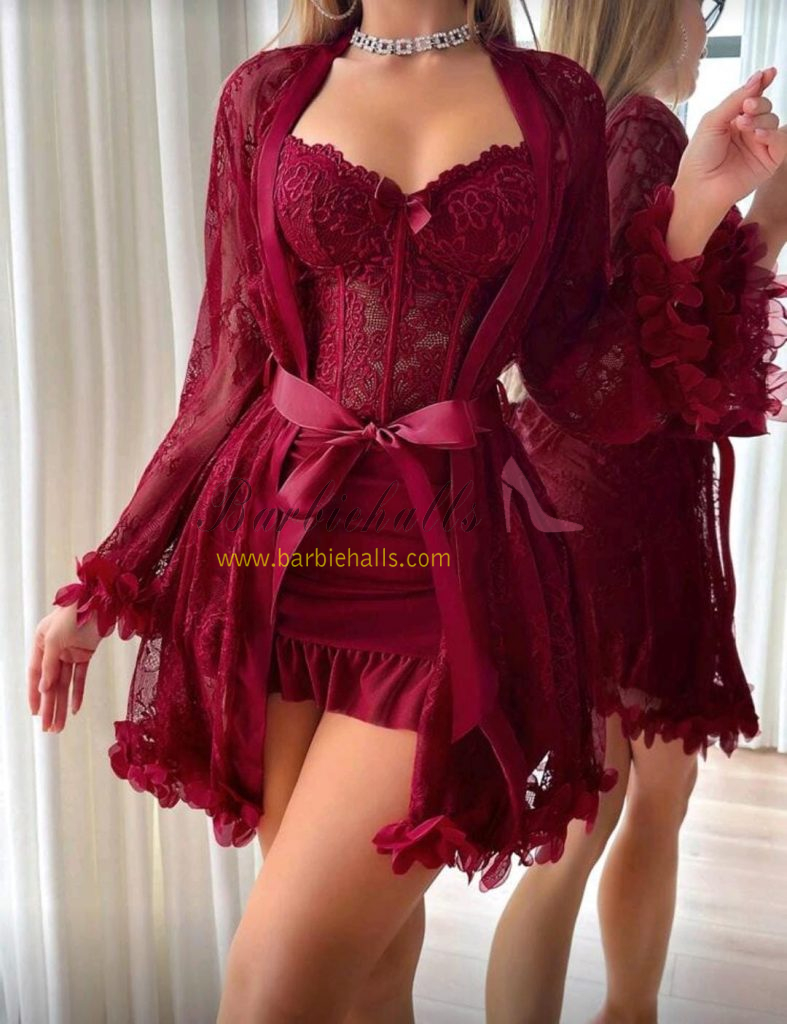 Set de 2 piezas: Bata de encaje floral 3D + Camisón de encaje con diseño de espina de pescado en la cintura.