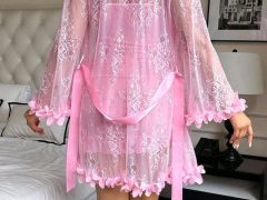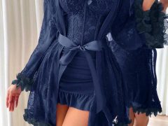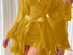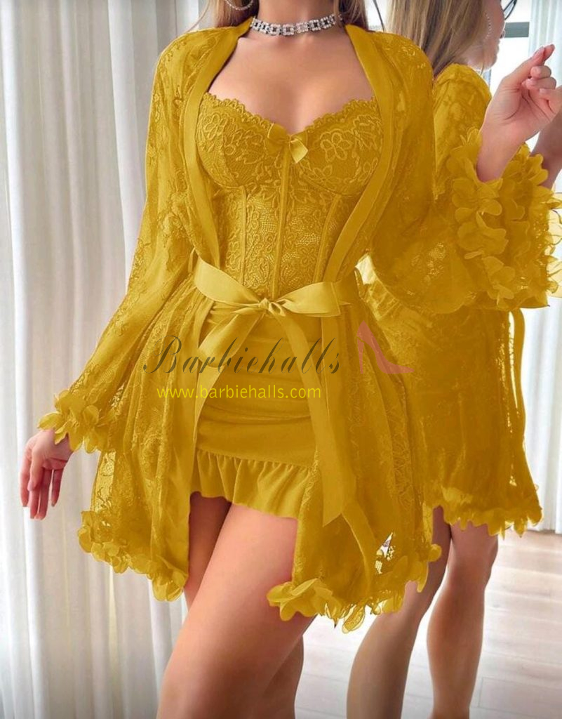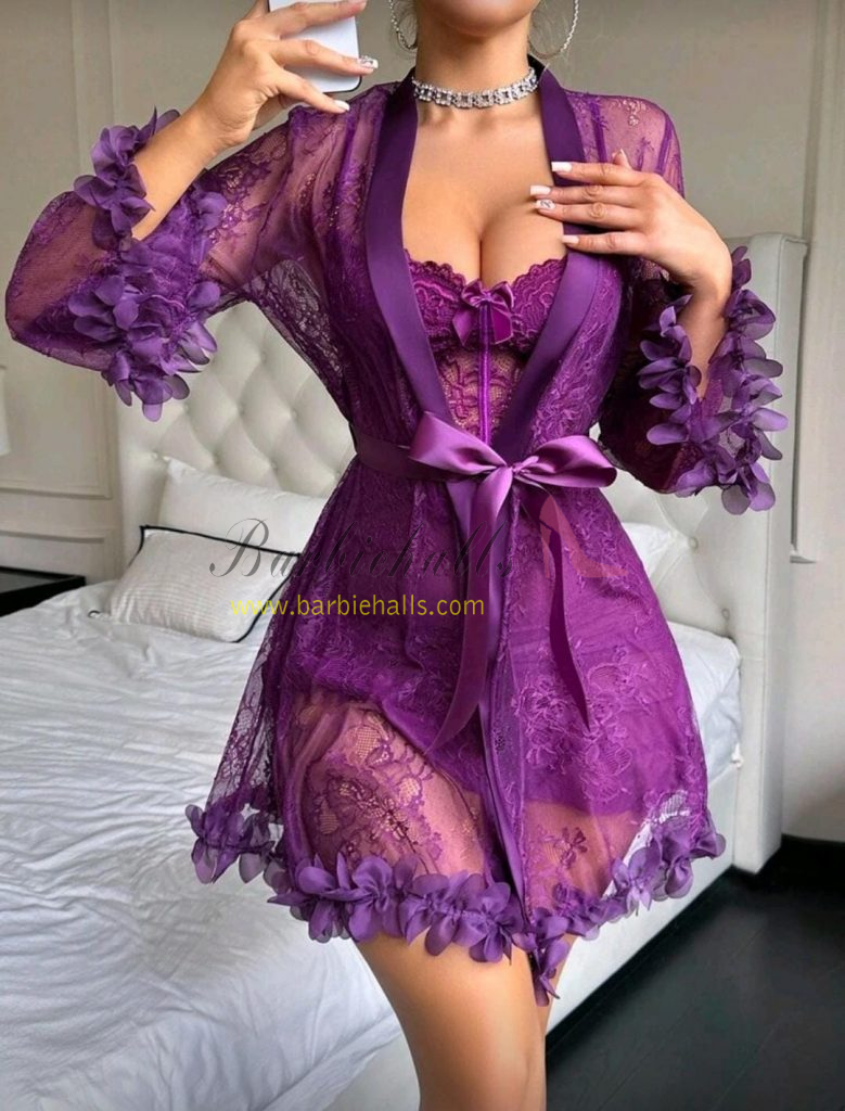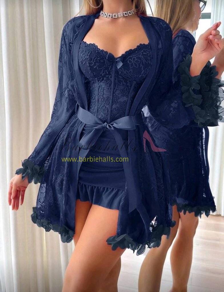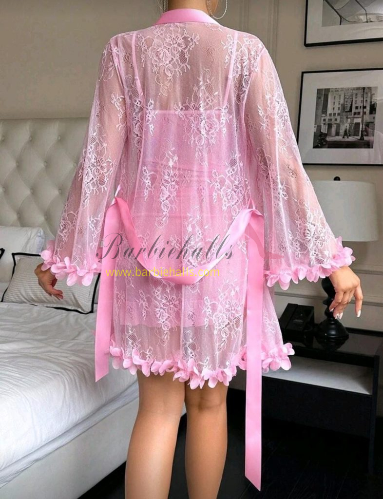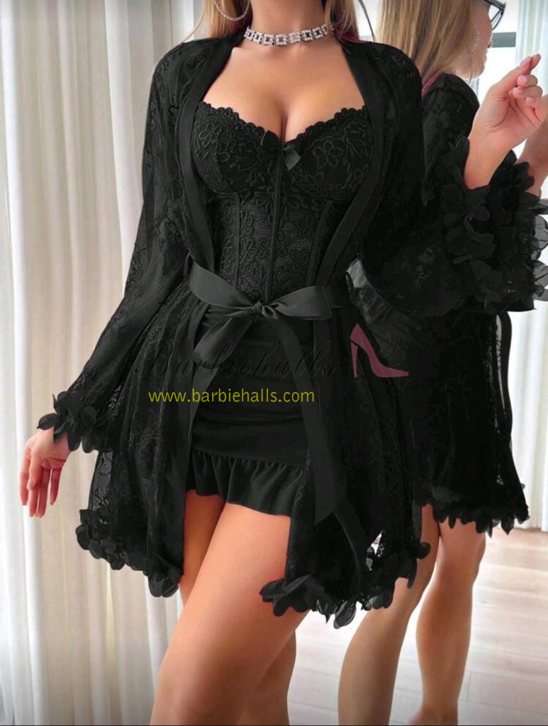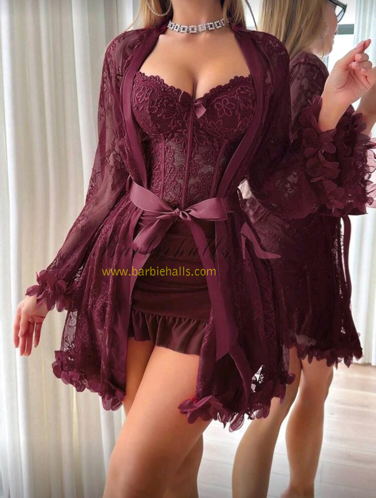 Set de 2 piezas: Bata de encaje floral 3D + Camisón de encaje con diseño de espina de pescado en la cintura.