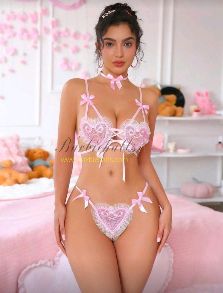 Conjunto de 2 piezas de pijama sexy de mujer con encaje de malla rosa y moño en forma de corazón, lencería sexy.